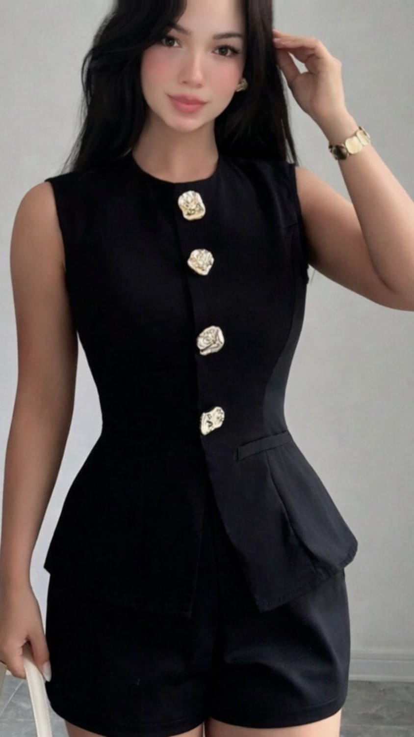 Conjunto casual y elegante de 2 piezas para mujer, que incluye una camiseta de tirantes con cinturón de moda (decorada con botones) y un pantalon corto Elegante.